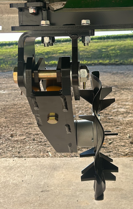The Rezidue Reaper is a heavy-duty residue management tool designed to be used with a harvester's corn head. Precision-engineered to till as you harvest, the innovative tillage attachment transforms your corn head and combine into a dual-purpose machine. Built to shred residue, the Rezidue Reaper blade aligns precisely with the row of corn, cutting and tilling the root ball zone. This approach lets farmers tackle minimum tillage right from the combine -no tractor needed- while minimizing tire wear, speeding up residue breakdown and improving soil fertility.